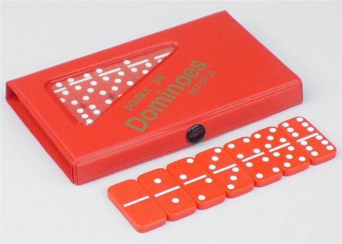 Mini double 6 dominoes for traveling, children, and they make neat, inexpensive gifts. Dominoes measure 9/16" x 1 3/16" x 3/16" thick. Packaged in a vinyl case with snap. Five colors available: White, Red, Blue, Green and Black.