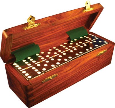 One Double Six Set of BlackDominoes (28 Tiles with Spinners) Tournament Jumbo Size (2" X 1" X 1/2").Comes in an Elegant Sheesham Wood Box with strong dovetail joints for storing. Read more...
