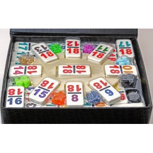 Deluxe, professional size, double 18, numbered set of dominoes. All double 18 sets have 190 dominoes. Great for longer play, more interesting play and bigger groups of players. Bright white dominoes with large, bold colored, recessed numbers. Embossed numbers prevent wear and insure long lasting readability. Smooth, acrylic feel dominoes. Each number is represented by a different color. Dominoes measure 2 inches, by 1 inch wide by 5/16 inch thick. Includes Snap Close Vinyl Case which measures approximately 9.00 x 7.5 x 3.5 inches. (Standard quality case that comes with most dominoe sets) Read more...