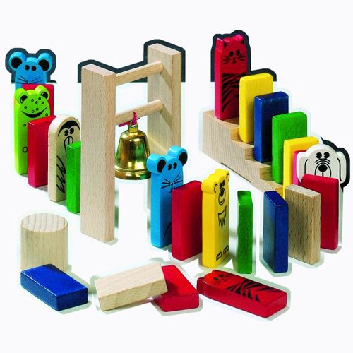 Children will enjoy designing the domino race any way they want with this 240 piece set and watch as the chain reaction happens when one is push down. All of the blocks will fall in a fascinating path from going up the stairs and down, across the bridge and ring the bell. All pieces are made from hardwood and have characters painted on to add to the fun. Made in Germany. Read more...