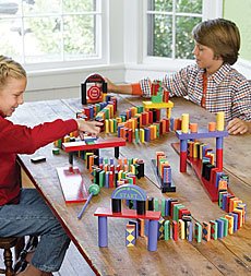Classic Domino Race Special Save .98 on the set!. Season after season, our customers have loved this best-selling game. So, we made it even better - we updated colors, added patterns, increased the number of pieces, and added a few new cool challenges. Arrange the dominos in a serpentine pattern, up and down steps, over and under bridges -- and end with a bang. Tip the first domino (or run a marble down the ramp) to start a chain reaction (the domino effect) that brings the whole array down in seconds! The Domino Race Set includes 255 pieces. The Add-On Set (24 pieces) brings more action to the race with a pyramid step set, tunnel set, ramp, and a ball. Domino Race Set includes 255 pieces 78 solid pieces (13 each, 6 colors) 78 squiggle striped pieces (13 each, 6 colors) 72 diamond printed pieces (12 each, 6 colors) 3 starting gates 3 finish gates 1 starting wand 1 end sign 6 pyramid steps 13-piece dowel stair and bridge set This game keeps children ages 4 to 12 involved for hours; teens and adults will want to join in, too. Classic Domino Race SpecialSave .98 when you buy our Domino Race Set and Add-On Set together. Only .98 WARNING CHOKING HAZARD (1,4 Read more...